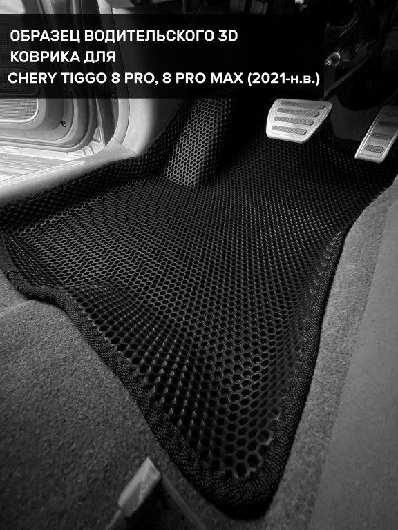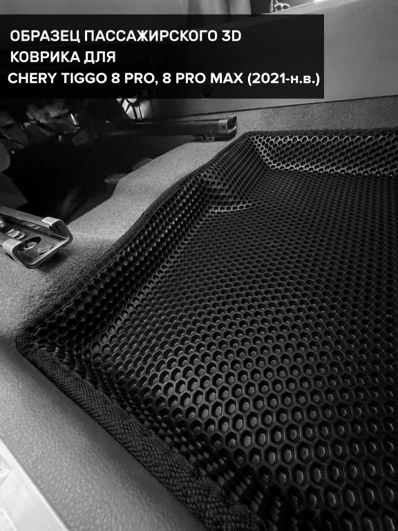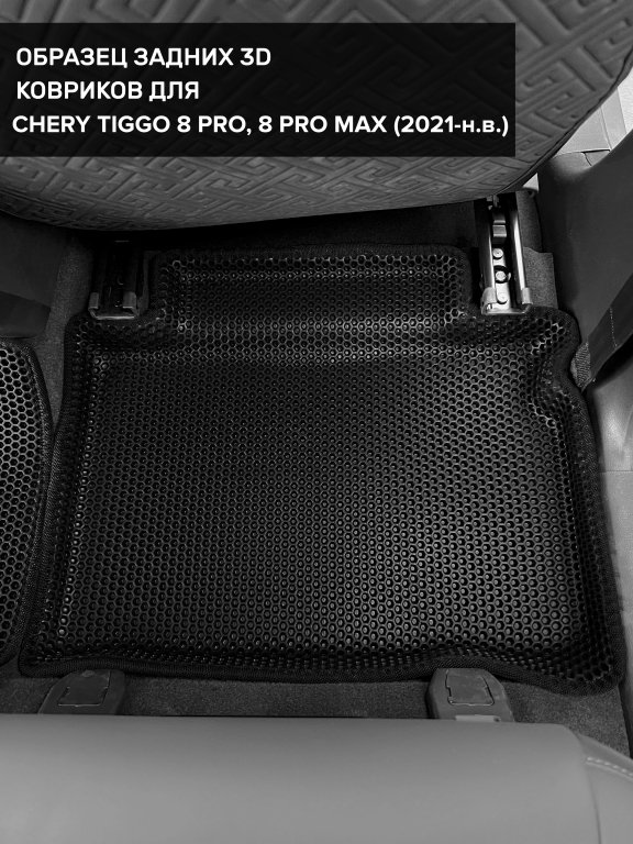 Автомобильные 3д коврики для Chery Tiggo 8 Pro (2021-н.в.) в салон авто и багажник сделаны из инновационного полимерного материала EVA, изысканная структура в виде ячеек не дает воде, пыли и снегу разлетаться по салону машины и багажнику. 3д коврики зафиксированы на полу определенными клипсами, соответствующими Chery Tiggo 8 Pro (2021-н.в.), и не двигаются в процессе езды.