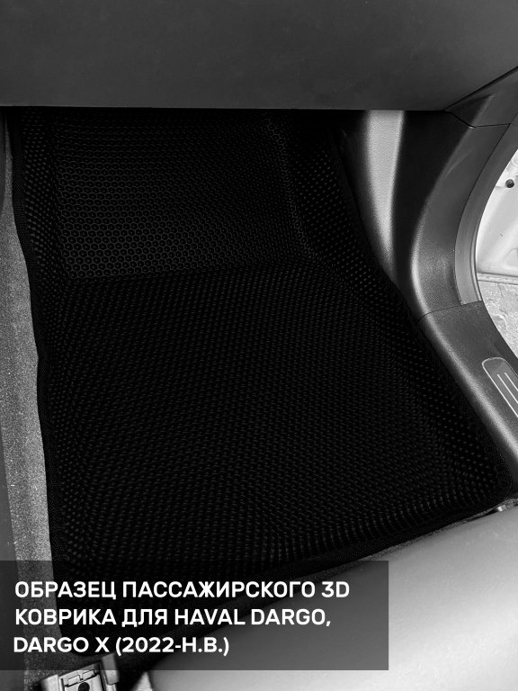 Автомобильные 3д коврики для Haval Dargo (2022-н.в.) в салон авто и багажник сделаны из инновационного полимерного материала EVA, изысканная структура в виде ячеек не дает воде, пыли и снегу разлетаться по салону машины и багажнику. 3д коврики зафиксированы на полу определенными клипсами, соответствующими Haval Dargo (2022-н.в.), и не двигаются в процессе езды.