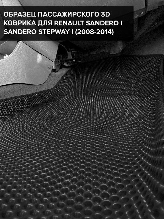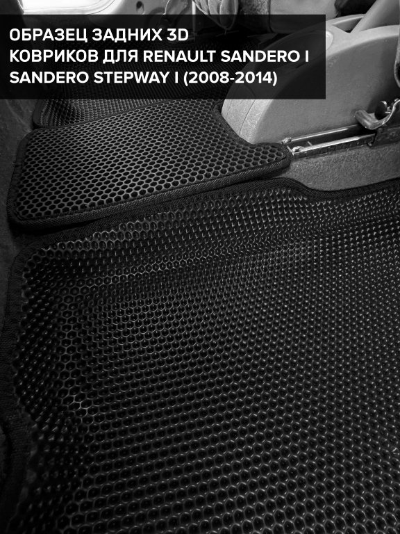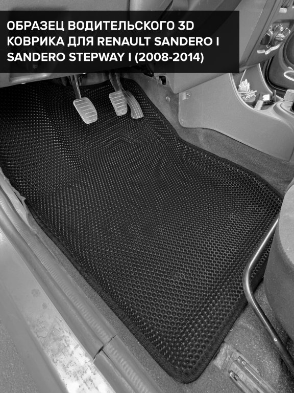 Автомобильные 3д коврики для Renault Sandero Stepway I (2010-2014) в салон авто и багажник сделаны из инновационного полимерного материала EVA, изысканная структура в виде ячеек не дает воде, пыли и снегу разлетаться по салону машины и багажнику. 3д коврики зафиксированы на полу определенными клипсами, соответствующими Renault Sandero Stepway I (2010-2014), и не двигаются в процессе езды.